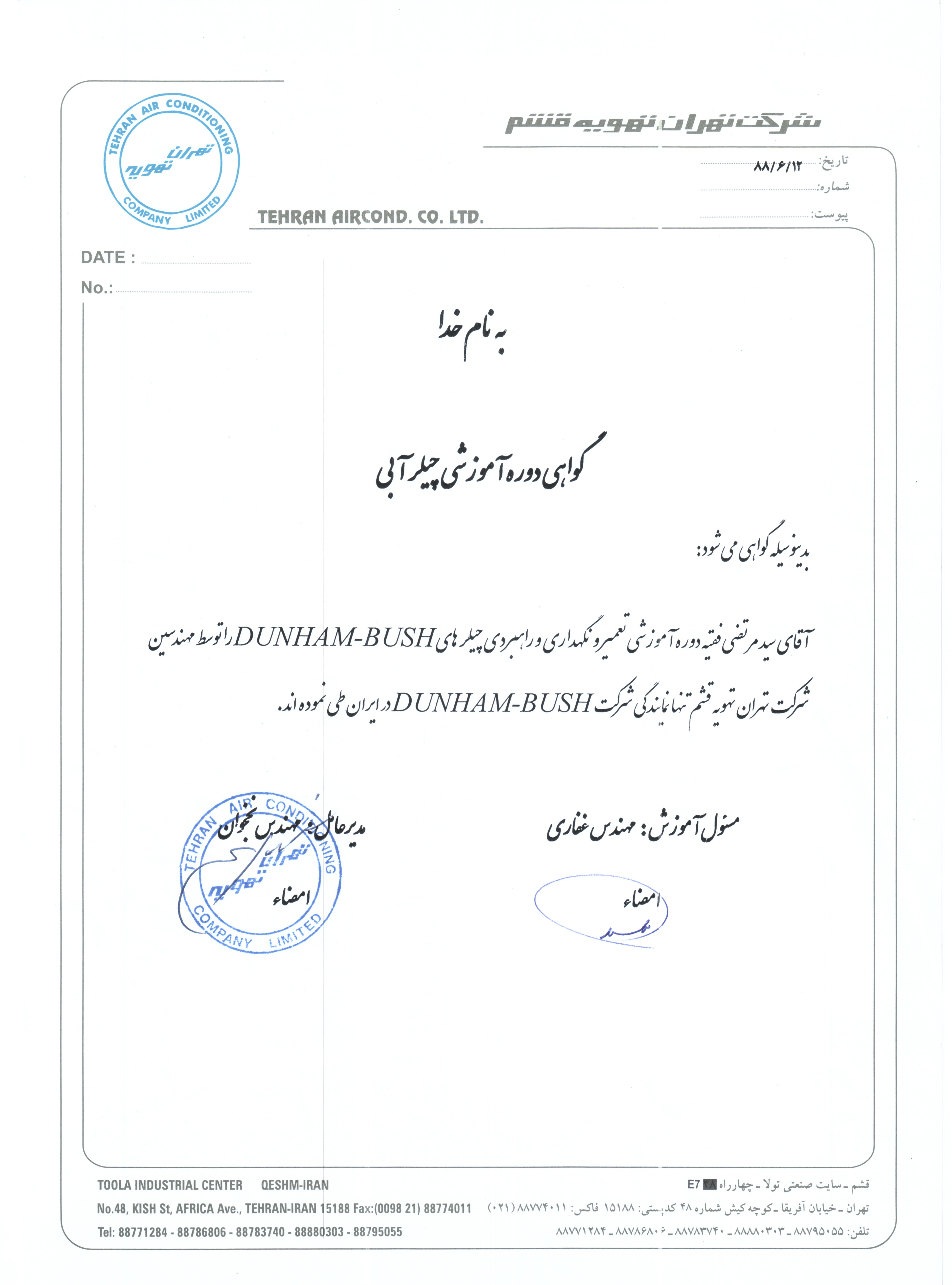 گواهینامه آموزشی چیلرهای تراکمی دانهام بوش آمریکا