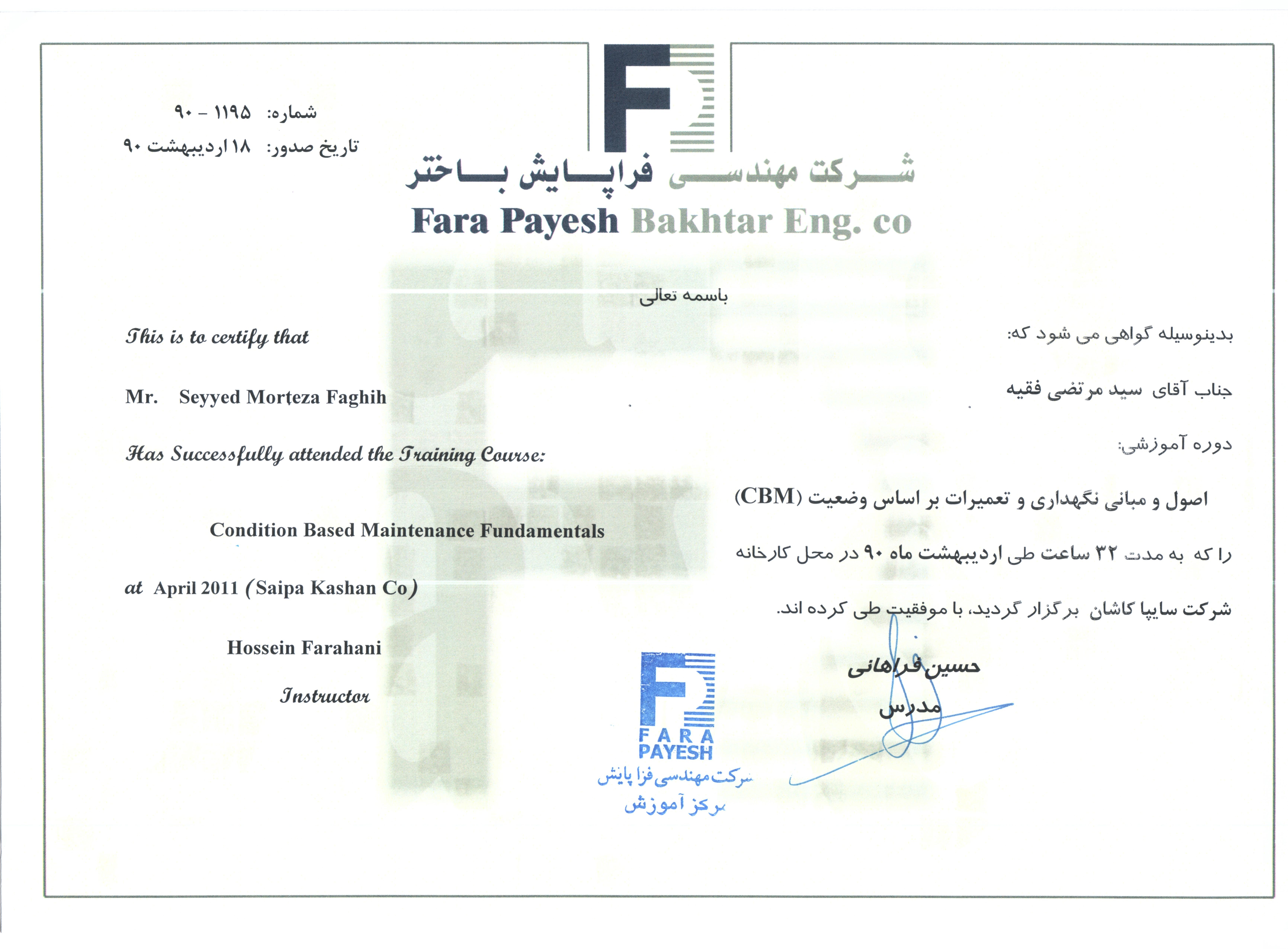 گواهینامه آموزشی اصول و مبانی نگهداری و تعمیرات بر اساس پایش وضعیت